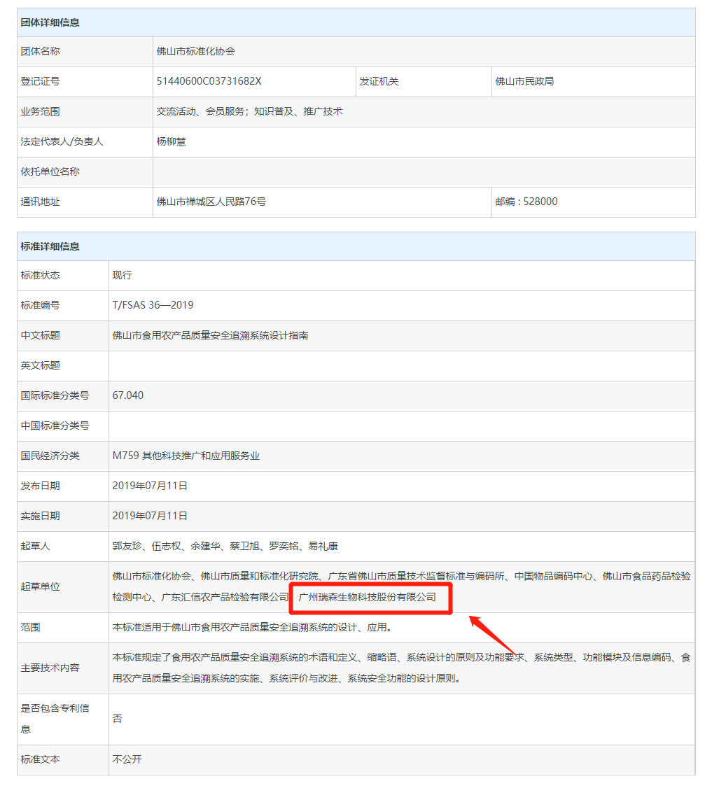 瑞森生物參與制定的T/FSAS 36—2019 《佛山市食用農(nóng)產(chǎn)品質(zhì)量安全追溯系統(tǒng)設計指南》團體標準于2019年7月11日在全國團體標準信息平臺發(fā)布公示。