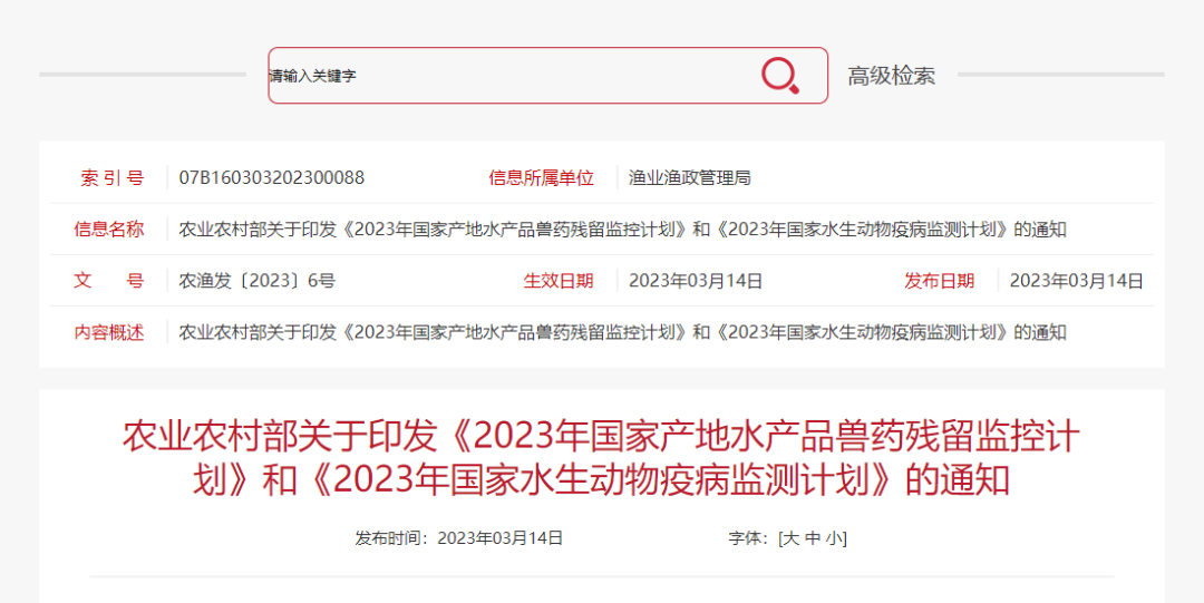各省、自治區(qū)、直轄市農(nóng)業(yè)農(nóng)村(農(nóng)牧)、漁業(yè)廳(局、委),計劃單列市漁業(yè)主管局,新疆生產(chǎn)建設(shè)兵團農(nóng)業(yè)農(nóng)村局,各有關(guān)單位: 為提升養(yǎng)殖水產(chǎn)品質(zhì)量安全和生物安全水平,保障水產(chǎn)品安全有效供給,推進水產(chǎn)養(yǎng)殖業(yè)綠色高質(zhì)量發(fā)展,根據(jù)《中華人民共和國漁業(yè)法》、《中華人民共和國農(nóng)產(chǎn)品質(zhì)量安全法》、《中華人民共和國動物防疫法》、《獸藥管理條例》等法律法規(guī),我部制定了《2023年國家產(chǎn)地水產(chǎn)品獸藥殘留監(jiān)控計劃》、《2023年國家水生動物疫病監(jiān)測計劃》?,F(xiàn)印發(fā)給你們,請認真組織實施執(zhí)行。有關(guān)要求通知如下。 (一)農(nóng)業(yè)農(nóng)村部漁業(yè)漁政管理局負責監(jiān)督管理水產(chǎn)養(yǎng)殖用獸藥及其他投入品的使用,負責提出和組織國家產(chǎn)地水產(chǎn)品獸藥殘留監(jiān)控計劃和國家水生動物疫病監(jiān)測計劃,發(fā)布監(jiān)控(測)結(jié)果,組織分析研判養(yǎng)殖水產(chǎn)品的質(zhì)量安全和養(yǎng)殖水生生物的生物安全形勢。 (二)中國水產(chǎn)科學(xué)研究院(以下稱“水科院”)負責具體組織實施國家產(chǎn)地水產(chǎn)品獸藥殘留監(jiān)控計劃,對各地監(jiān)控工作給予技術(shù)指導(dǎo)。中國水產(chǎn)科學(xué)研究院質(zhì)量與標準研究中心(以下稱“水科院質(zhì)標中心”)負責國家產(chǎn)地水產(chǎn)品獸藥殘留監(jiān)控計劃抽檢結(jié)果的匯總、分析和會商等工作。國家水產(chǎn)品質(zhì)量監(jiān)督檢驗中心等水產(chǎn)品質(zhì)檢機構(gòu)(以下稱“質(zhì)檢機構(gòu)”)負責協(xié)助開展國家產(chǎn)地水產(chǎn)品獸藥殘留監(jiān)控計劃的抽樣、檢測和結(jié)果報送等工作。 (三)全國水產(chǎn)技術(shù)推廣總站負責具體組織實施國家水生動物疫病監(jiān)測計劃,組織各省級水生動物疫病預(yù)防控制(水產(chǎn)養(yǎng)殖病害防治、水產(chǎn)技術(shù)推廣)機構(gòu)(以下稱“省級水生動物疫控機構(gòu)”),協(xié)調(diào)水生動物疫病參考實驗室和相關(guān)檢測機構(gòu),開展全國水生動物疫病監(jiān)測,指導(dǎo)各省份開展監(jiān)測、凈化與評估工作;組織首席專家開展監(jiān)測信息的分析評估、疫病形勢會商和疫情預(yù)警工作;及時完成監(jiān)測結(jié)果匯總、分析和上報;發(fā)生突發(fā)水生動物疫情時,及時組織開展緊急監(jiān)測診斷處置工作。負責國家產(chǎn)地水產(chǎn)品獸藥殘留監(jiān)控計劃中水產(chǎn)養(yǎng)殖動物主要病原菌耐藥性監(jiān)測的具體組織實施工作,負責組織各級水產(chǎn)技術(shù)推廣機構(gòu)和相關(guān)專家開展水產(chǎn)養(yǎng)殖用藥減量行動和規(guī)范用藥科普下鄉(xiāng)活動,及時調(diào)度各地工作情況和總結(jié)。 (四)省級主管部門負責組織實施本轄區(qū)內(nèi)國家產(chǎn)地水產(chǎn)品獸藥殘留監(jiān)控計劃和國家水生動物疫病監(jiān)測計劃,加強產(chǎn)地水產(chǎn)品獸藥殘留管控,做好水生動物疫病防控,制定和組織實施省級產(chǎn)地水產(chǎn)品獸藥殘留監(jiān)控(監(jiān)督抽查)計劃和水生動物疫病監(jiān)測計劃,對轄區(qū)內(nèi)各級主管部門開展的產(chǎn)地水產(chǎn)品獸藥殘留監(jiān)控和水生動物疫病監(jiān)測等工作進行指導(dǎo)。 (一)加強組織領(lǐng)導(dǎo)。加強養(yǎng)殖水產(chǎn)品質(zhì)量安全監(jiān)管和養(yǎng)殖水生生物疫病防控是保障水產(chǎn)品安全有效供給的基礎(chǔ)。地方各級農(nóng)業(yè)農(nóng)村(漁業(yè))主管部門務(wù)必要高度重視這兩項工作,強化組織領(lǐng)導(dǎo),細化職責分工,壓實各級責任,加強部門聯(lián)動,不折不扣地完成國家產(chǎn)地水產(chǎn)品獸藥殘留監(jiān)控計劃和國家水生動物疫病監(jiān)測計劃的各項工作任務(wù)。 (二)強化經(jīng)費保障。依據(jù)《中華人民共和國農(nóng)產(chǎn)品質(zhì)量安全法》、《中華人民共和國動物防疫法》等法律,各地農(nóng)業(yè)農(nóng)村(漁業(yè))部門要將產(chǎn)地水產(chǎn)品獸藥殘留監(jiān)控和水生動物疫病監(jiān)測工作納入本級財政預(yù)算,落實監(jiān)管責任,確保工作取得實效。國家產(chǎn)地水產(chǎn)品獸藥殘留監(jiān)控計劃和國家水生動物疫病監(jiān)測計劃中國家負責部分所需經(jīng)費納入中央財政預(yù)算。 (三)推進源頭治理。地方各級農(nóng)業(yè)農(nóng)村(漁業(yè))主管部門要持續(xù)加強水產(chǎn)品質(zhì)量安全和水生生物生物安全的源頭管控,結(jié)合水產(chǎn)綠色健康養(yǎng)殖技術(shù)推廣“五大行動”的實施,推廣生態(tài)健康養(yǎng)殖技術(shù)模式,升級基礎(chǔ)設(shè)施裝備,配套水產(chǎn)良種和防病技術(shù),規(guī)范日常管理和獸藥使用,持續(xù)提升養(yǎng)殖主體的質(zhì)量安全和疫病防控意識。相關(guān)省份要開展海參和牛蛙養(yǎng)殖用藥專項整治“回頭看”工作,嚴厲打擊養(yǎng)殖生產(chǎn)中違法用藥行為。 (四)加強協(xié)作配合。地方各級農(nóng)業(yè)農(nóng)村(漁業(yè))主管部門及執(zhí)法機構(gòu)要統(tǒng)籌協(xié)調(diào)好漁業(yè)與獸藥、飼料、農(nóng)藥、質(zhì)量安全等部門的聯(li