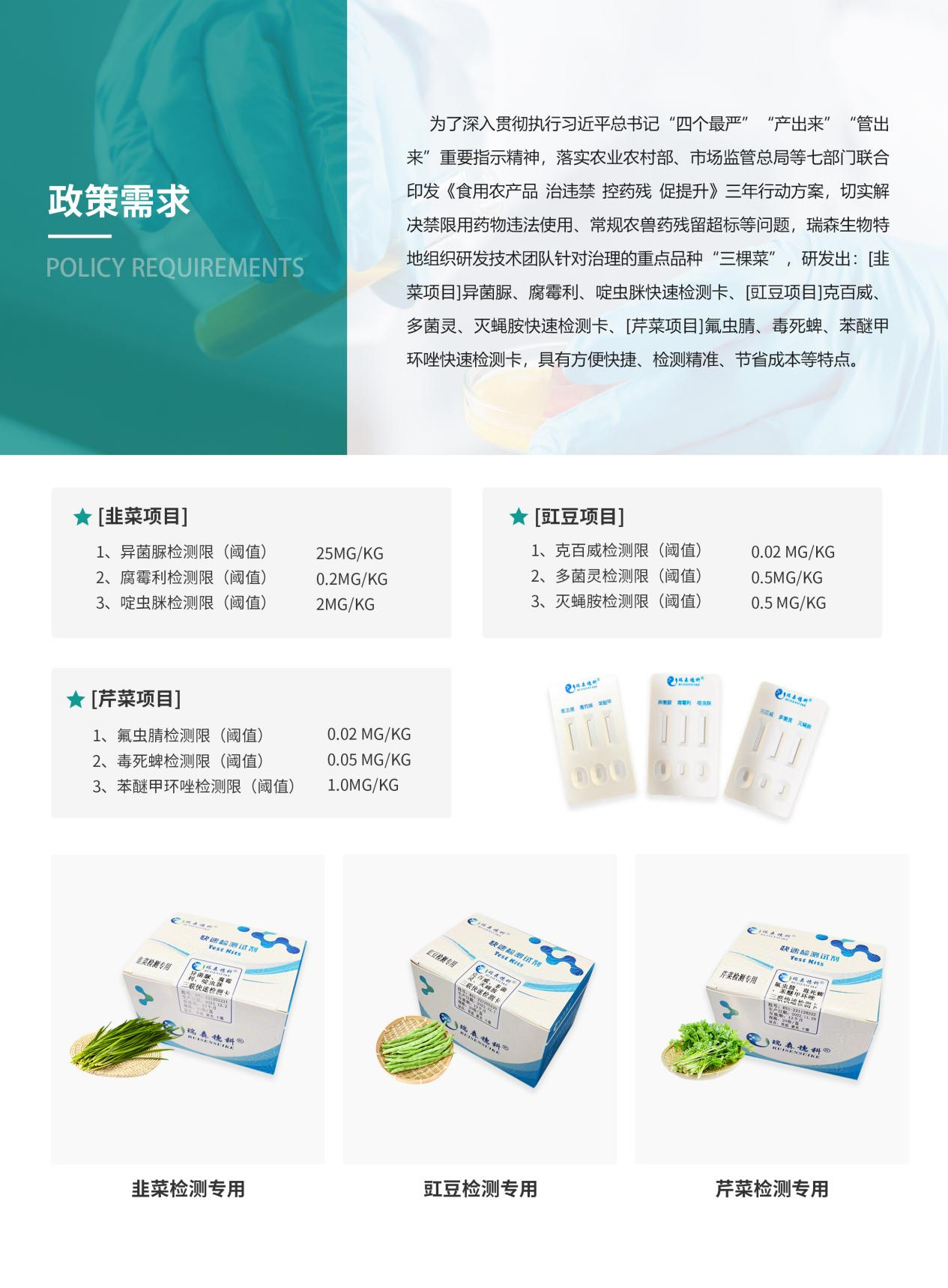 瑞森生物認(rèn)真學(xué)習(xí)和貫徹農(nóng)業(yè)農(nóng)村部2023年全國農(nóng)產(chǎn)品質(zhì)量安全監(jiān)管工作會議精神,積極擁護(hù)和響應(yīng)《中華人民共和國食品安全法》。早在2021年國家農(nóng)業(yè)農(nóng)村部發(fā)布了《食用農(nóng)產(chǎn)品“治違禁 控藥殘 促提升”三年行動方案》的通知后,瑞森生物就積極擁護(hù)和響應(yīng)文件精神,并針對《方案》中提到的需要重點(diǎn)治理的11種農(nóng)產(chǎn)品:“三棵菜”、“一枚蛋”、“一只雞”、”肉牛肉羊“、“四條魚”,推出了相關(guān)的新品應(yīng)對方案,包括”農(nóng)藥殘留膠體金多聯(lián)檢測產(chǎn)品系列“、”禽蛋藥殘專項(xiàng)檢測解決方案“、”熒光定量快速檢測產(chǎn)品“等相關(guān)技術(shù)領(lǐng)先的新型檢測產(chǎn)品。有效解決了國家食用農(nóng)產(chǎn)品存在的安全隱患問題,充分保障了老百姓”菜籃子“上的安全。