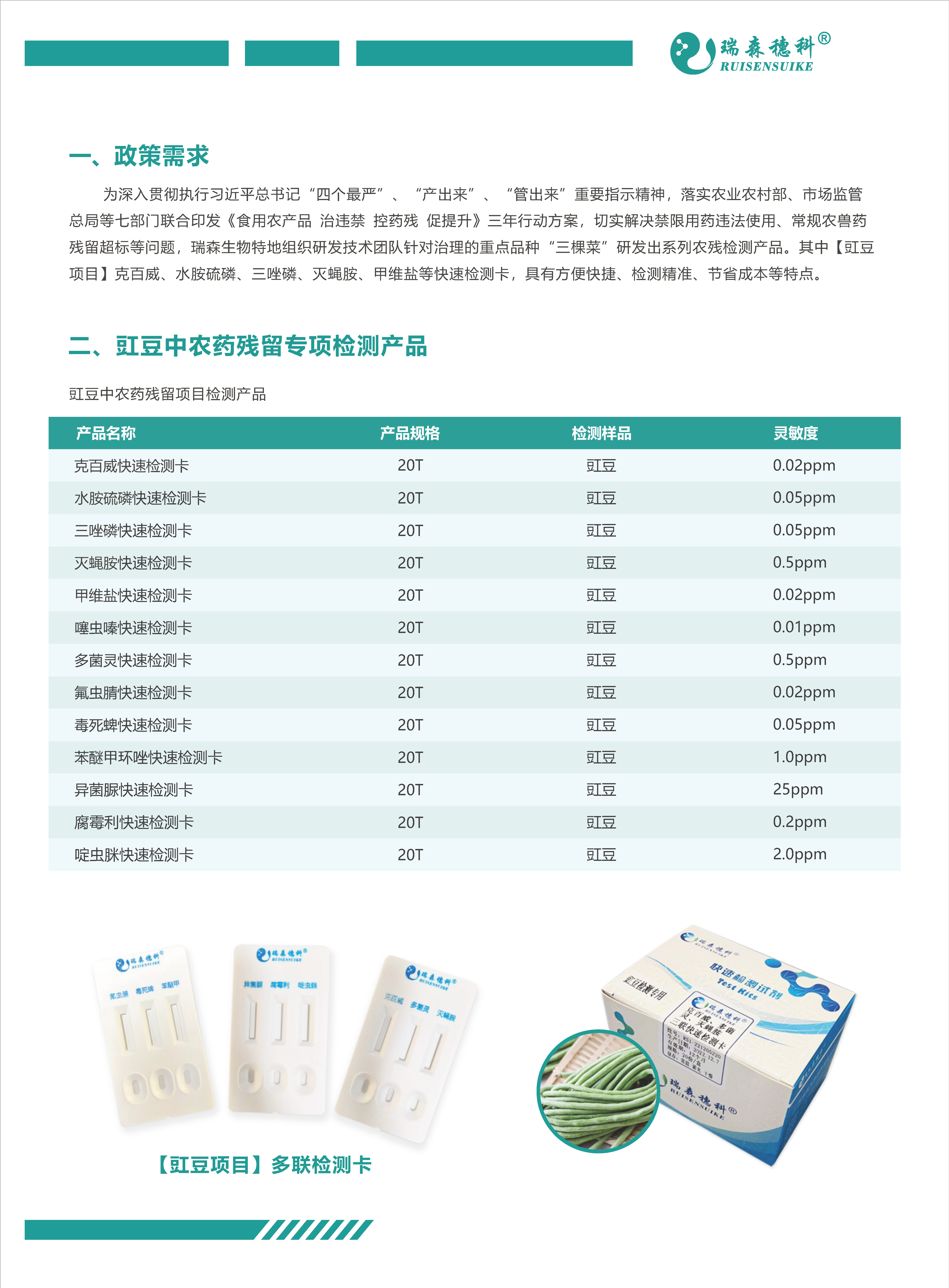瑞森生物認(rèn)真學(xué)習(xí)和貫徹國家《農(nóng)產(chǎn)品質(zhì)量安全法》,積極擁護(hù)和響應(yīng)農(nóng)業(yè)農(nóng)村部《食用農(nóng)產(chǎn)品“治違禁 控藥殘 促提升”三年行動(dòng)方案》文件精神。針對(duì)《方案》中提到的需要重點(diǎn)治理的“豇豆”農(nóng)產(chǎn)品,瑞森生物推出了“豇豆藥殘專項(xiàng)檢測(cè)解決方案”,有效解決了豇豆中農(nóng)藥殘留的相關(guān)問題。