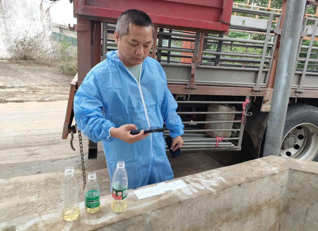 為解決養(yǎng)殖場戶的跑腿問題,湛江市的官方獸醫(yī)接收到檢疫任務(wù)后,統(tǒng)一持著定制的移動終端機(jī)到養(yǎng)殖場實(shí)施現(xiàn)場檢疫。檢疫現(xiàn)場,查看養(yǎng)殖檔案、瘦肉精抽檢、查驗(yàn)運(yùn)輸車輛備案情況、查驗(yàn)生豬的畜禽標(biāo)識佩戴情況、臨床檢查,一系列檢疫程序,官方獸醫(yī)利用移動終端機(jī)一一記錄,并現(xiàn)場拍照取證、錄入畜禽標(biāo)識編號。檢疫合格后養(yǎng)殖場會收到微信公眾號發(fā)送的6位數(shù)字檢疫證明提取碼。