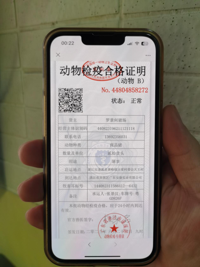 裝車完畢,養(yǎng)殖場不再需要前往鄉(xiāng)鎮(zhèn)的動物檢疫申報(bào)點(diǎn)領(lǐng)取紙質(zhì)檢疫證明,憑著提取碼即可獲取檢疫證明電子證照。獸醫(yī)的上門檢疫服務(wù),檢疫證明的無紙化,讓養(yǎng)殖場切切實(shí)實(shí)感受到了前所未有的便捷?!熬W(wǎng)上申報(bào)、網(wǎng)上受理、現(xiàn)場檢疫、電子證照”的檢疫模式,徹底打通服務(wù)養(yǎng)殖場戶“最后一公里”。