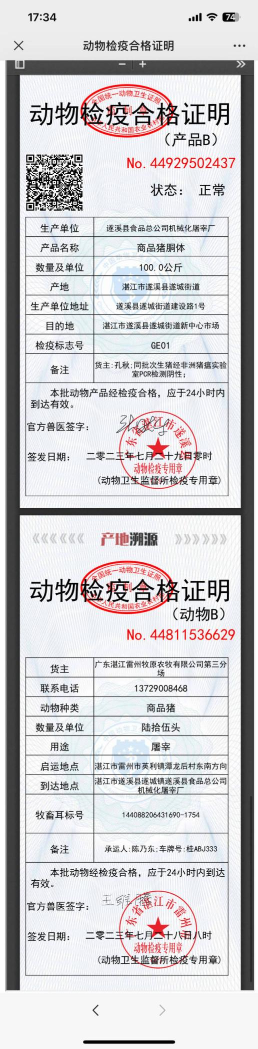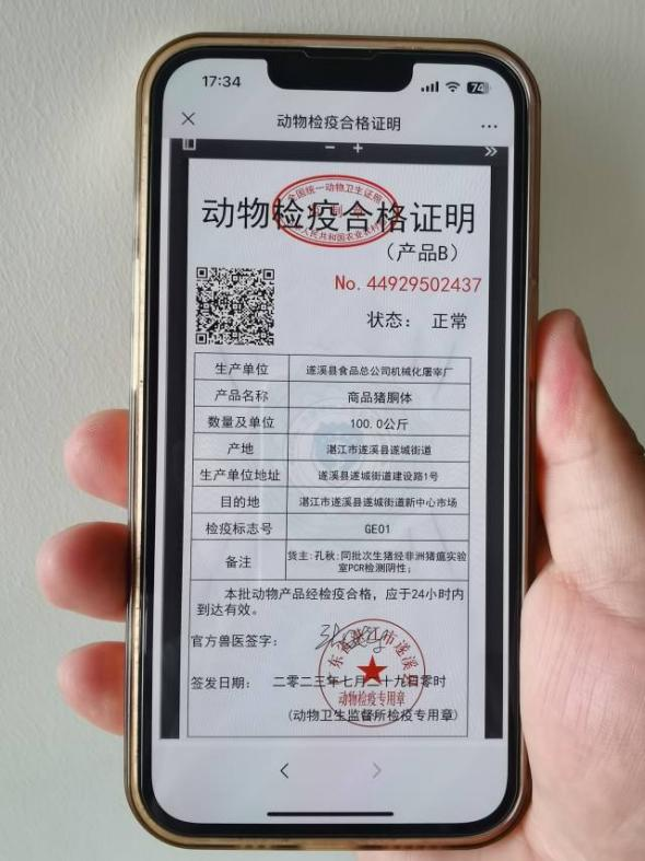 7月29日凌晨12點57分,遂溪縣食品總公司機械化屠宰廠的駐場官方獸醫(yī)開出了湛江市首張動物檢疫合格證明(產(chǎn)品B)電子證照,這是繼本月初無紙化出具動物B證后,湛江市動物檢疫工作在信息化建設(shè)上又一次新的突破;標(biāo)志著湛江市動物檢疫合格證明無紙化改革工作、全鏈條檢疫追溯監(jiān)管體系建設(shè)又邁出了歷史性的一步,成為全省首個在產(chǎn)地檢疫與屠宰檢疫環(huán)節(jié)同時實現(xiàn)無紙化出證的地級市。